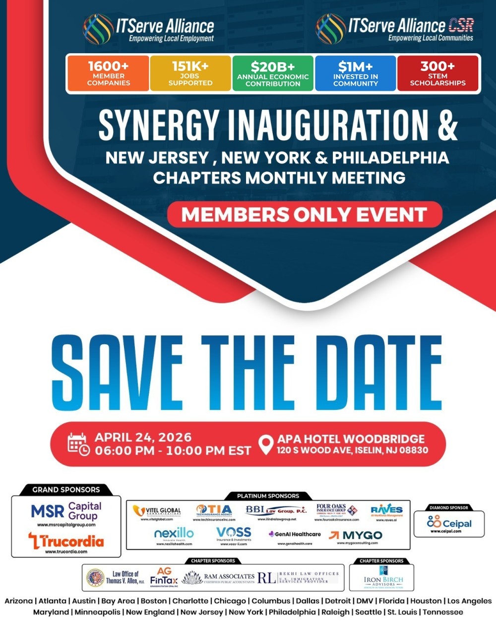 ITServe Alliance is pleased to invite you to an exclusive Board Members-Only Synergy Inauguration & New Jersey, New York & Philadelphia Chapters Monthly Meeting